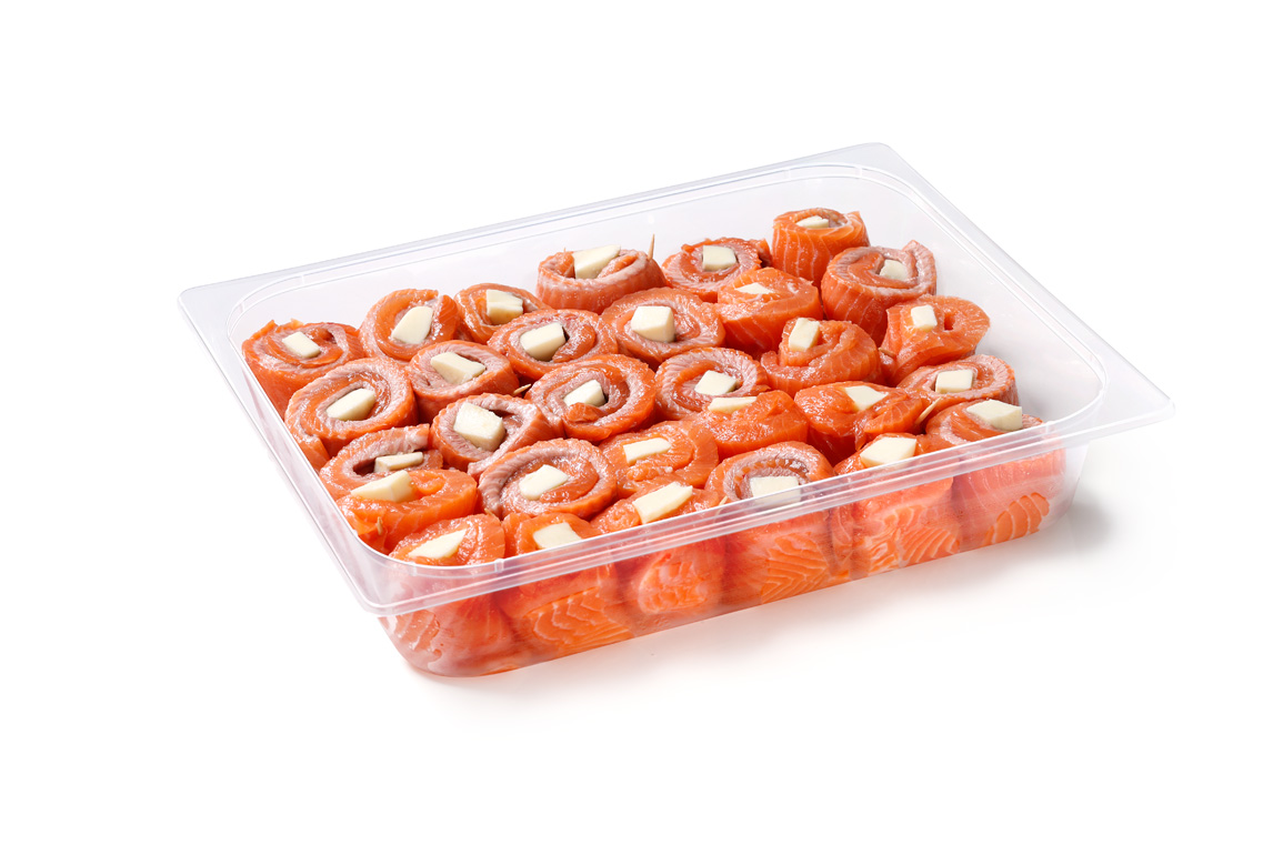 ROTOLINI DI FILETTO DI TROTA SALMONATA PRIVI DI SPINE CON MOZZARELLA IN VASCONE TRASPARENTE ATM