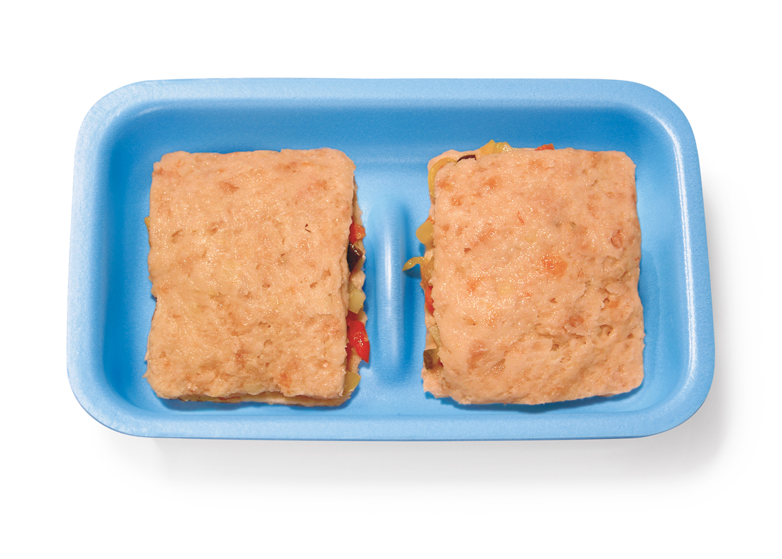 TRAMEZZINO CON FILETTI DI TROTA SALMONATA, FILETTI DI MERLUZZO E GAMBERI ROSSI MACINATI ASSIEME, FARCITO CON VERDURE A CUBETTI COTTE A VAPORE IN VASSOIO ATM A PESO VARIABILE