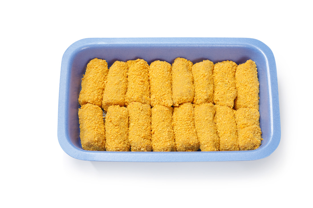 BASTONCINI CON FILETTI DI TROTA SALMONATA MACINATI CON POMODORO, MOZZARELLA E ORIGANO COSPARSI DI PANGRATTATO IN VASSOIO ATM A PESO FISSO