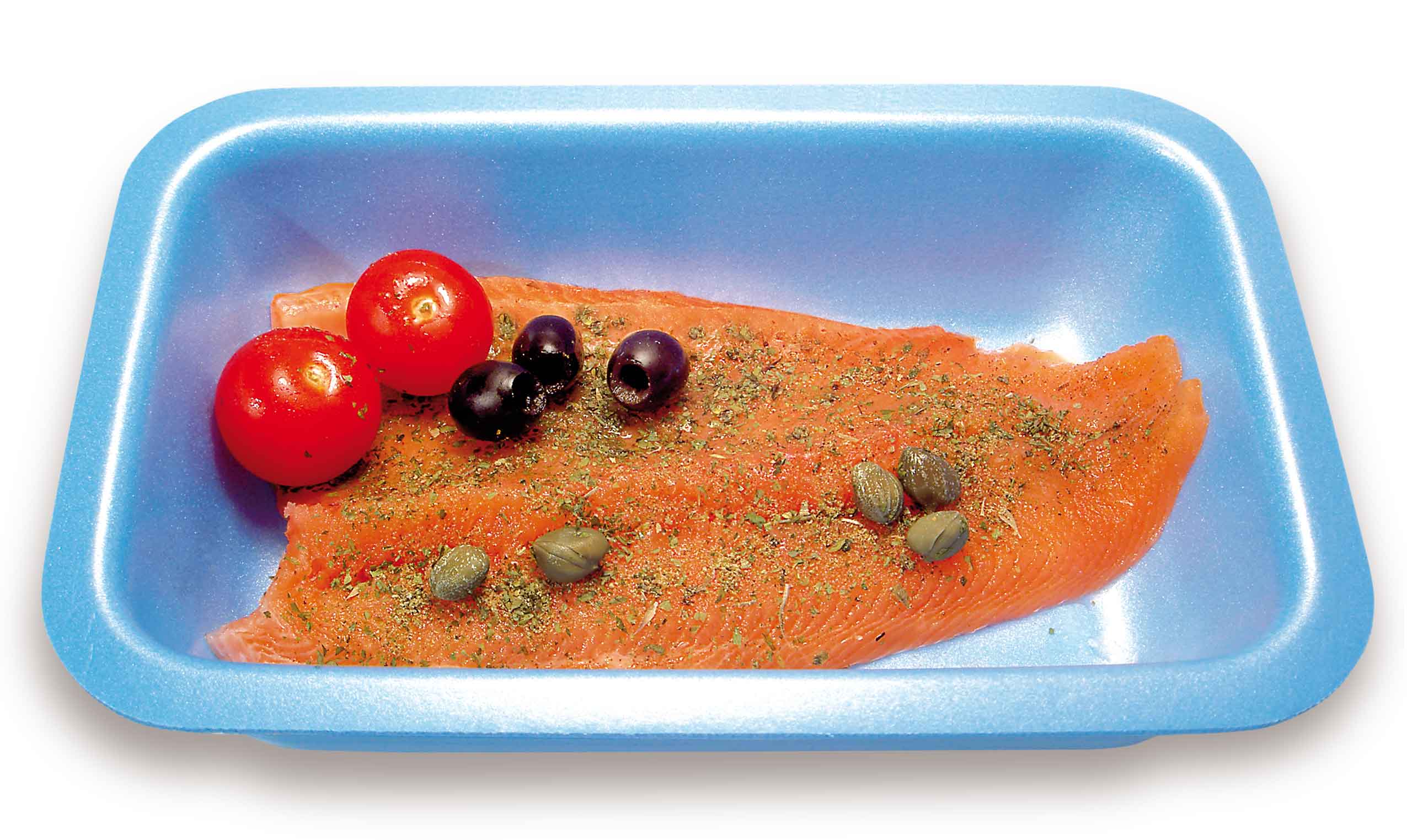 FILETTO DI TROTA SALMONATA PRIVO DI LISCHE E SENZA PELLE CON POMODORINI, OLIVE E CAPPERI IN VASSOIO PORZIONATO A PESO VARIABILE